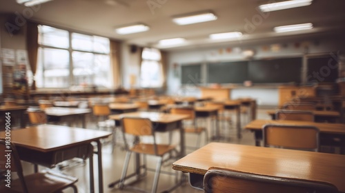 Empty Japanese Classroom Desks, Chairs, Blackboard, Windows