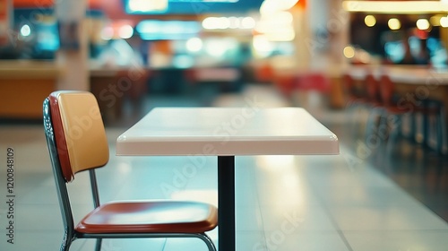 Empty Table at Food Court: A single chair sits at an empty table in a bustling food court, creating a sense of quiet solitude amidst the vibrant activity.