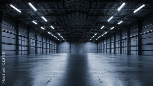 Empty warehouse interior, symbolizing potential and opportunity. Ideal for logistics, real estate, and industrial design projects.