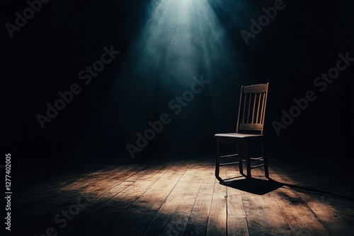 Empty wooden chair on stage floor, spotlight, dramatic dark setting