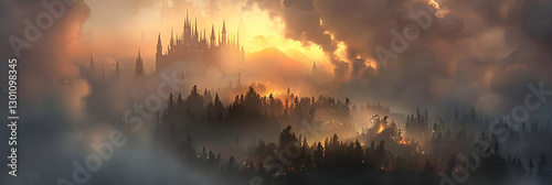 fantasy, kingdom, castle, church steeple, mist, mystical, forest, enchanted, saga, adventure, magical, legend, creature, epic, heroic, ancient, timeless, aethereal, mythical, landscape, mediaeval, myth, dreamlike, serene, majestic, fairy tale, lore, fable, enchanted forest, mysterious, legendary