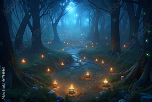 enchanted forest, lantern, candlelight, lichterkette, aethereal, dreamlike, fantasy, mysterious, enchantment, magic, night time, wood, pathway, illumination, glowing, sparkling, shimmering, fairy tale, wonderland, enchanting, serene, peaceful, tranquil, nature, landscape, scenic, atmosphere, moody, dark, ambient, lighting, fantasy art, digital artwork