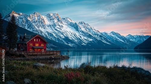 Enchanting Red House by the Lake with Snowy Mountain Backdrop, Blooming Red Flowers & Lush Greenery