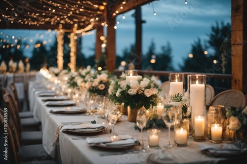 Enchanting Wedding Table Setting with String Lights and Candles. Nighttime Elegance