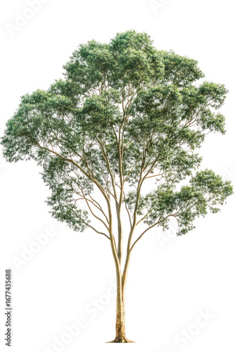 Eucalyptus tree with tall straight trunk and narrow leaves on transparent background