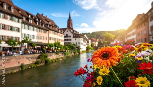European city by river with flowers