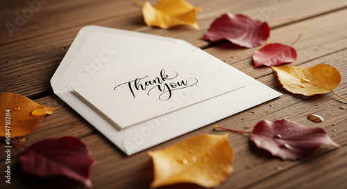 thank you, gratitude, autumn, fall, leaf, card, message, writing, stationery, paper, envelope, wooden, rustic, table, natural, seasonal, emotion, sentiment, appreciation, thank, greeting, communication, human relationships, personal, thoughtful, sincere, warm, cosy, elegant, script, calligraphy, design, simple, clean, overhead, closeup, detail, texture, wood grain, waterdrop, autumn color, fall season, expression, connection