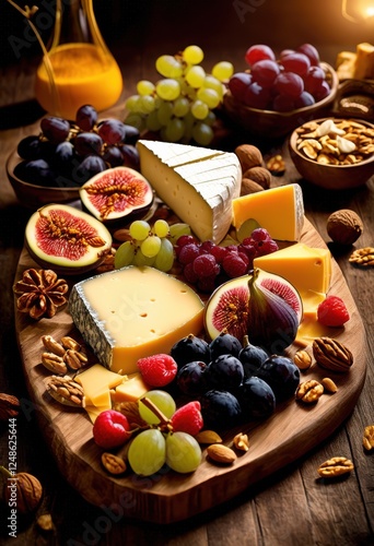 exquisite luxurious cheese board presentation featuring various nuts arranged textured wooden surface, arrangement, charcuterie, platter, gourmet, dairy