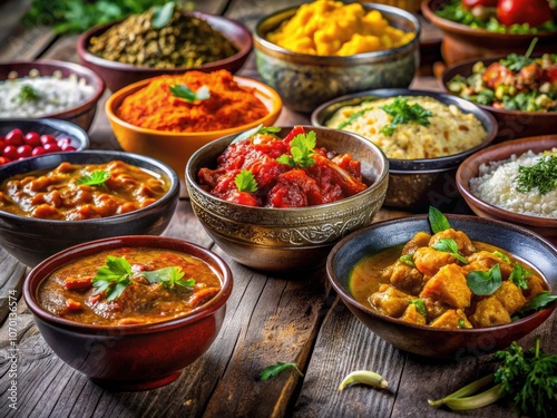 Exquisite Macro Photography of Traditional Indian Food Bowls on Dark Table – Vibrant Spices, Rich Textures, Authentic Cuisine, Culinary Art, Indian Dishes, Cultural Heritage