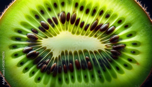Extreme macro kiwi cross-section: bright green pulp & tiny black seeds. Vibrant fruit detail, juicy. Fresh food close-up, natural.