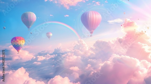 f Bright balloons and vivid rainbows on a blue sky with pink clouds, Colorful hot air balloons above the clouds, Hot air balloons in the sky with rainbow and clouds, fantasy background