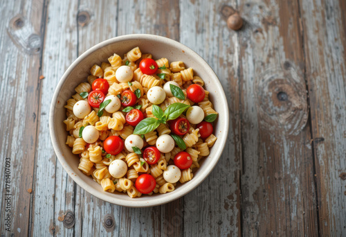 farfalle, mozzarella, tomatoes, basil, copy space, wooden table, italian cuisine, topview, vegetarian meal