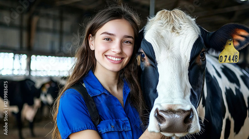 Farm Life Connection: A young woman, radiant with a genuine smile, leans in close to a gentle cow in a barn setting, showcasing a connection between humanity and animal care on a farm.