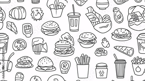fast food, pattern, doodle, illustration, burger, fries, pizza, hot dog, seamless, soda, editable, design, food, repeat, clip art, minimal, icon, trendy, hand-drawn, contemporary, print, commercial, fast, artistic, graphic, meal, taste, wallpaper, pop art, enclosed, drawing, fun, cola, snack, deliciously, junk food, sandwich, art, cafes