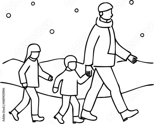 silhouette, father, children, family, winter, snow, walking, holding hands, people, childhood, eltern, together, cold, season, illustration, drawing, outline, simple, minimalist, day, activity, bonding, parenting, children, boy, girl, winter scene, snowfall