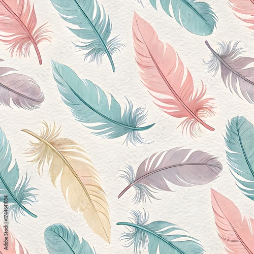 Feather Pattern in Pastel Paper Texture. Repeating pastel feathers over paper texture with subtle fringe shadows—elegant motif.