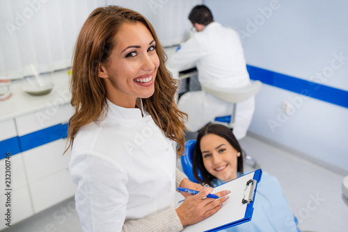 Female dentist in Dental office holding folder