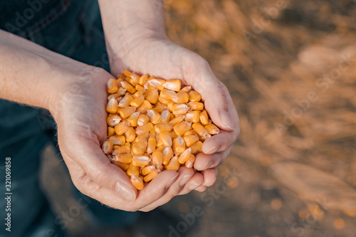 Female farmer handful of harvested corn grains, close up