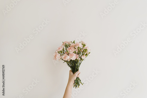 Female hand holds delicate pink carnation flowers bouquet. Close up view floral composition