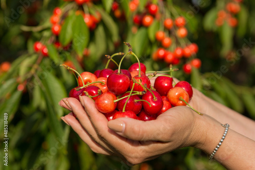 food, red, fruit, ripe, summer, cherry, concept, sweet, garden, hand, hold, tray, box, full, nature, tree, branch, green, harvest, agriculture, fresh, texture, organic, crop, healthy, leaf, natural, juicy, plant, vitamin, tree branch, berry, season, nourishment, grow, farm, farmer, delicious