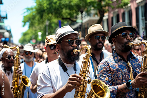 Festival de Jazz en Nueva Orleans: Escena de músicos en un desfile en las calles