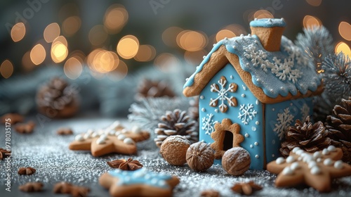 Festive Christmas baking scene featuring cookies and a gingerbread house in blue and brown tones bokeh banner copy space
