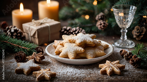 Festive Christmas cookies beautifully arranged on a decorative surface, radiating holiday cheer and sweetness