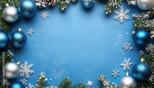 Festive christmas decoration with blue ornaments and snowflakes winter wonderland flat lay holiday atmosphere cheerful vibes