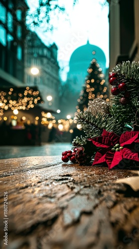 christmas, holiday, festive, decoration, ornament, winter, table, wooden, background, bokeh, light, blurry, city, market, christmas tree, christmas flower, berry, red, green, cosy, ambience, celebration, season, christmas, winter landscape, holiday spirit, merry christmas, happy holiday, festive season, weihnachtsmarkt, night