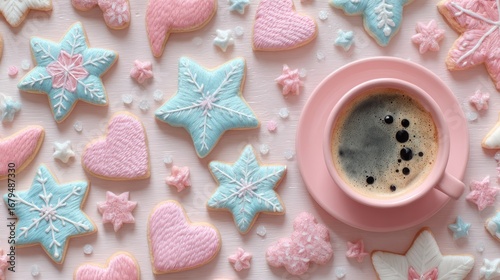 cookie, frosted, decorated, gingerbread, christmas, winter, nubes, star, snowflake, pastel, pink, hot drink, cup, saucer, sweetened, sweet, treat, baked, holiday, pretty, delicious, icing, sugary, light, delicate, morning, breakfast, afternoon, treat, festive, charming, edible, art, pattern, top, view, flat, lay
