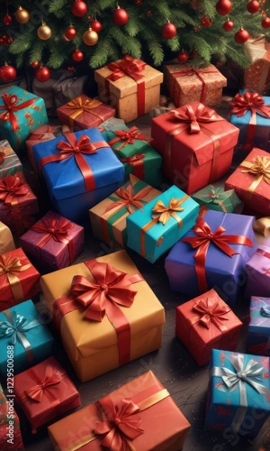 festive holiday background with wrapped gifts, pine branches, starry night sky, Christmas ornaments