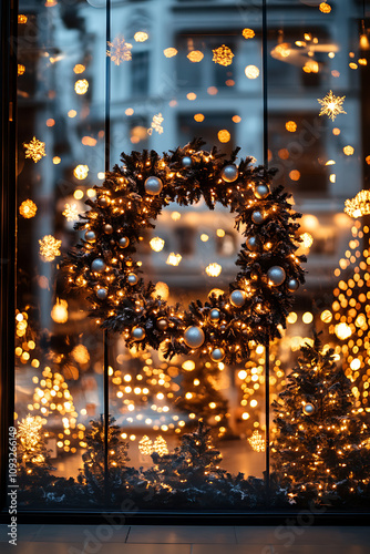 Festive minimalist storefront withsingle wreath on the door and softly glowing lights framing the window