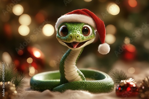 festive, snake, santa, hat, holiday, decoration, christmas, cute, adorable, reptile, bokeh, background, green, eye, merry, joyful, seasonal, fun, cheerful, smiling, closeup, ornament, sparkle, amusing, whimsy, colourful, celebration, novelty, vibrant, bright, wintery, playful, fantasy, unique, charming, warm, glowing, whimsical, magic, enchanting, delightful