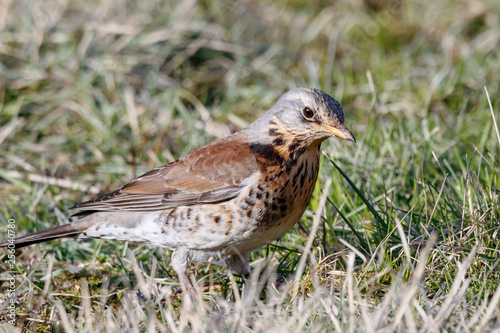 Fieldfare (Turdus pilaris) sitting on grass in early spring looking for food. Cute common funny thrush. Bird in wildlife.