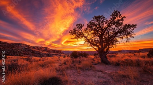 Fiery Sunset Sky Over Lone Desert Tree Landscape