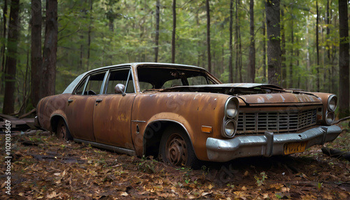 moss, forest, nature, time, green, quiet, weathering, steel, branch, rot, solitude, pathos, shadow, gravitation, damp, jungle, debris, disrepair, weed, wind, grass, bodywork, light, decay, density, peace, wheel, survivor, past, rust-eaten, vintage, aged, vehicle, car, abandoned, antique, retro, isolated