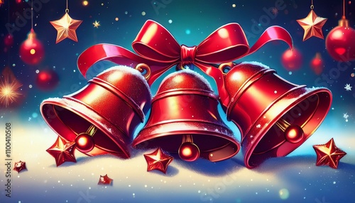 하얀 눈 위에 놓인 빨간 크리스마스 종과 주변에 반짝이는 작은 별들