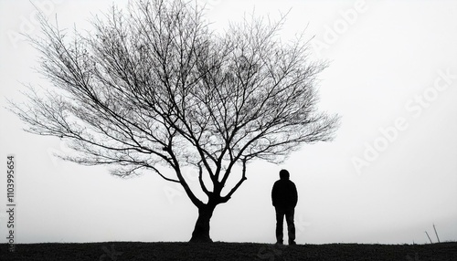 겨울철 나뭇잎이 없는 가지 아래 혼자 서 있는 사람의 실루엣