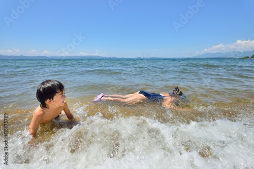 children, boy, toddler, child rearing, person, people, family, family, camping, swim, play, rejoice, happy, fun, lake, lakeshore, waterfront, nature, blue skies, sky, sunny, summer, midsummer, summer getaway, background, background, copy space, japan