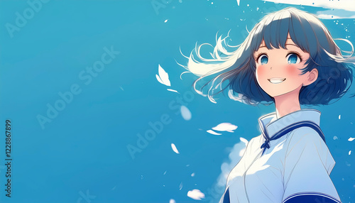 春 アニメ・漫画風の女の子 さわやかで元気なイメージ 風に髪をなびかせ笑顔で前を向く 学生・新社会人・希望・旅行・嬉しい表情・休日・解放