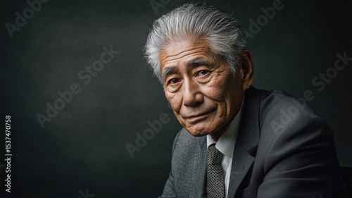 portrait, japanese, man, aged, studio, suit, expression, elegance, classic, fold, intelligence, calm, dignity, depth of field, textured, closeup, minimalist
