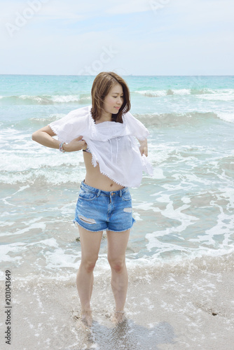 take off, swimwear, woman, sea, woman, woman, girl, young, youth, beach, resort, vacation, leisure, summer, midsummer, stand, beach, smile, smile, smile, smile, smile, joyful, fun, summer getaway, vacation, relax, japanese, blue skies, bare skin, refreshing, barefoot, t-shirt, short, denim, sexy, healthy, bikini