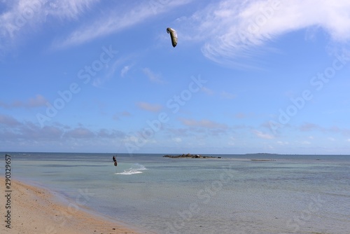 sea, beach, water, kite, sky, sport, surf, surf, blue, wind, wave, sunset, gull, bird, summer, sand, nature, kitesurfing, landscape, flying, coast, sun, new caledonia