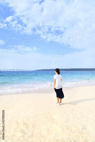 ビーチに立つ女の子(沖縄 宮古島 与那覇前浜 後姿)