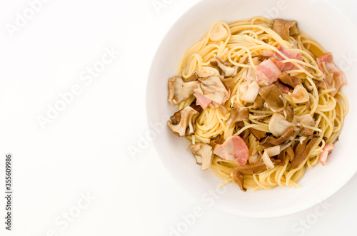 pasta, spaghetti, noodle, mushroom, mushroom, mushroom, bacon, meat, garlic, garlic, potherb, herb, soy sauce, dish, delicious, delicious, food, food, food, meal, meal, hood, white background, dish