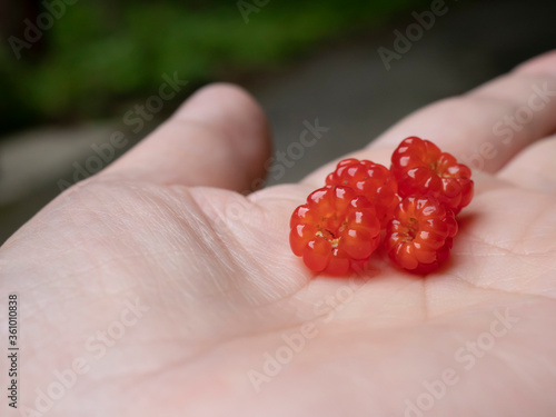 mountain, mountaineering, outdoors, trek, hike, woman, hand, red, sweet, landscape, food, climb, closeup, wild, fruit, fruit, palm, copy space