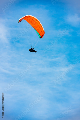 パラグライダーが青い空を背景に飛ぶ姿が気持ちよい夏の風景を表す王子ヶ岳の風景