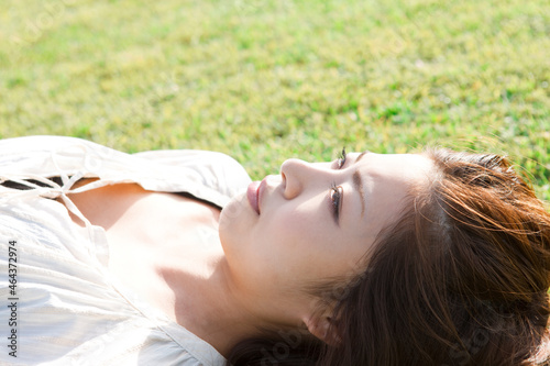 芝生に寝転んでいる女性