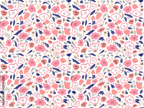 ラフな雰囲気の手描きの花柄 シームレスパターン/白背景