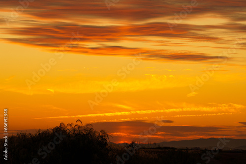 sunset, miscanthus sinensis, sky, nature, orange, landscape, cloud, red, light, yellow, silhouette, horizon, lovely